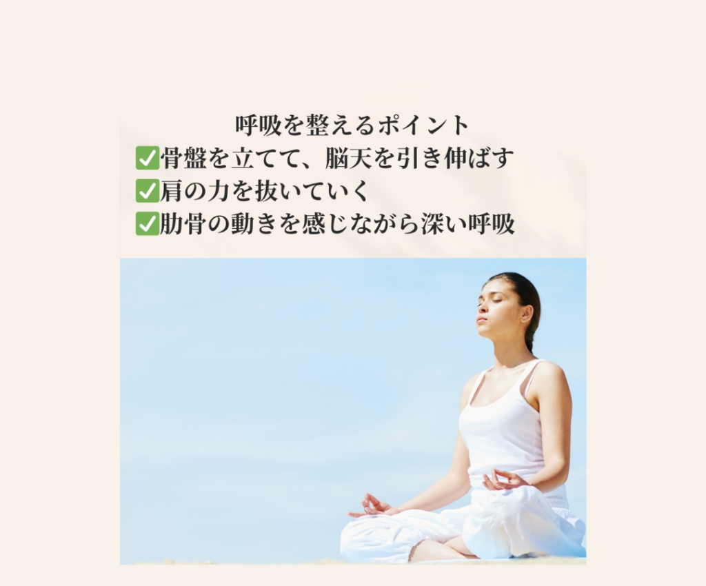 つい肩に力が入りやすい方も多いですが、肩の緊張は浅い呼吸の原因になります。吸う息で背中を広げ、吐く息で肩の力を抜いていくことで、リラックスしながらも深い呼吸が可能になります。呼吸とともに筋肉の余分な力が抜け、首や肩のこりの改善にもつながります。