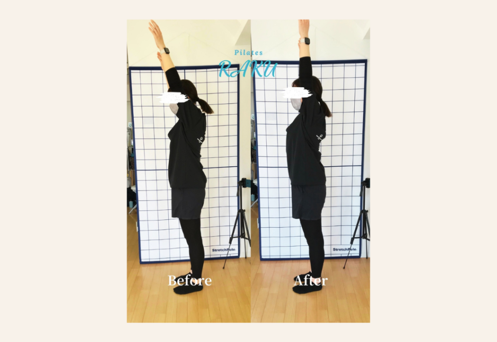Beforeでは腰の反りが強く、肋骨が前に開きやすい状態です。この姿勢は、見た目だけでなく、腰や肩まわりに負担がかかりやすく、日常動作で疲れやすくなる一因にもなります。