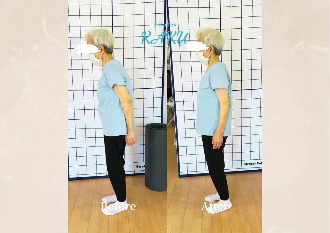 こんにちは!ピラティスRAKUです。 今回のテーマは「姿勢改善」。写真のBeforeとAfterを比べると、同じ方でも肩の位置や背骨の伸び方が大きく変わっている…